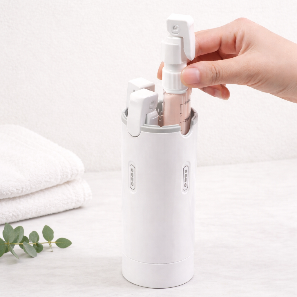 Nie – dispenser został zaprojektowany tak, aby dozować produkt bez konieczności wyjmowania buteleczek. To wygodne i szybkie, szczególnie w podróży.